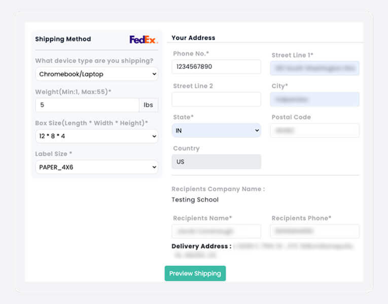 - Select the device you’re shipping, along with the box weight, box size, and label size. Then, enter your delivery address.